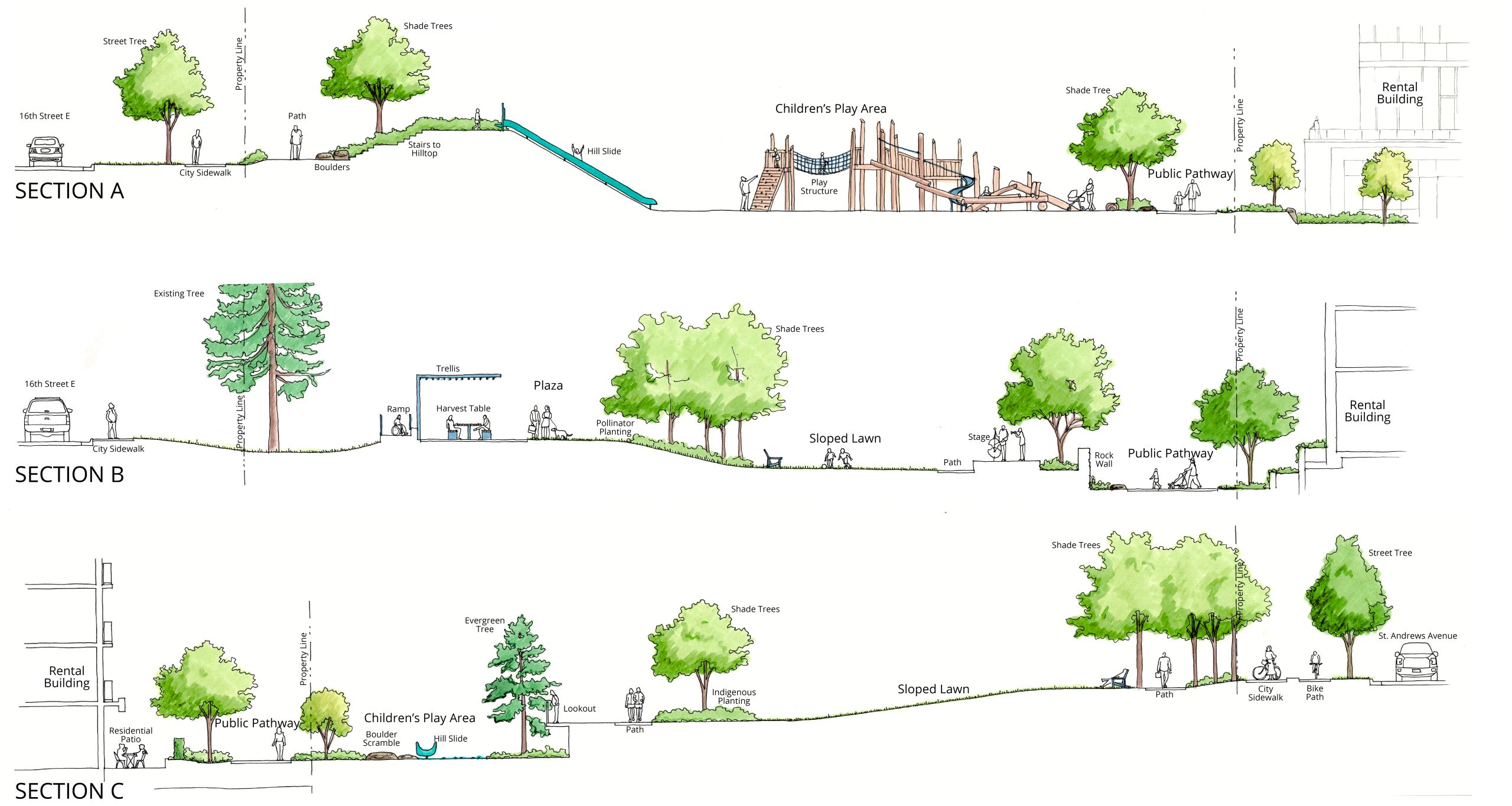 In 2021, the City conducted community engagement to help design for a new neighbourhood park at 16th Street East and St Andrews Avenue. The design seeks to create an inclusive, sustainable park that supports active family fun in East Central Lonsdale. It includes:
