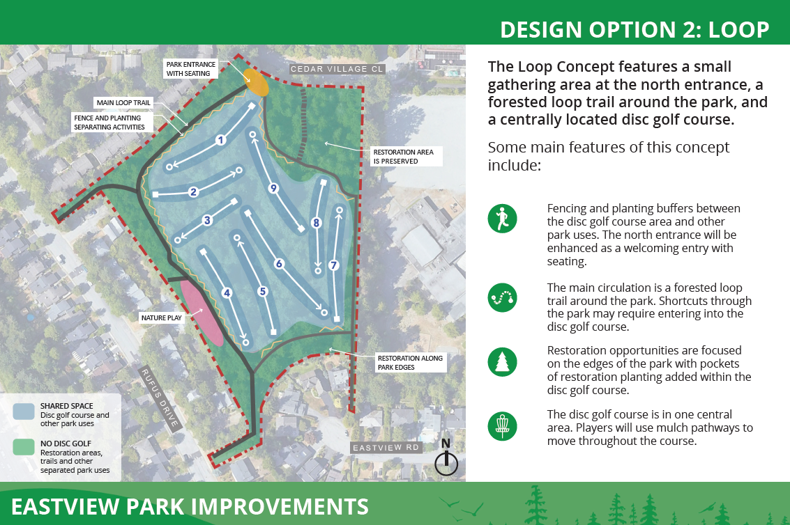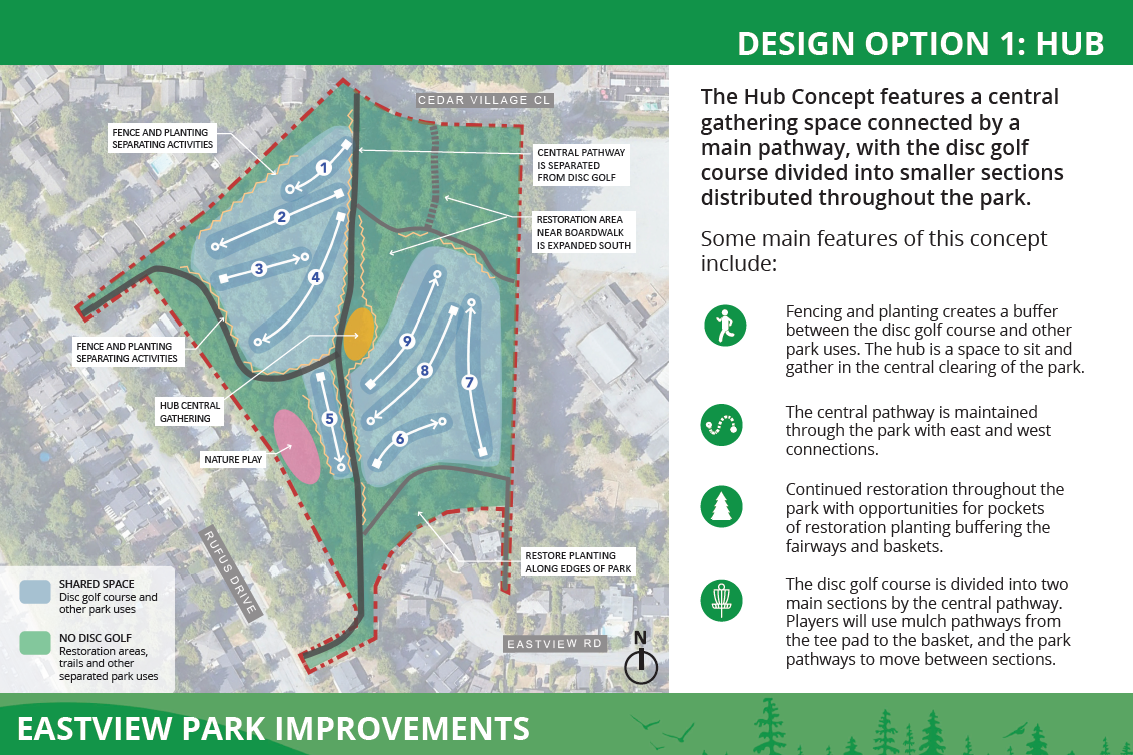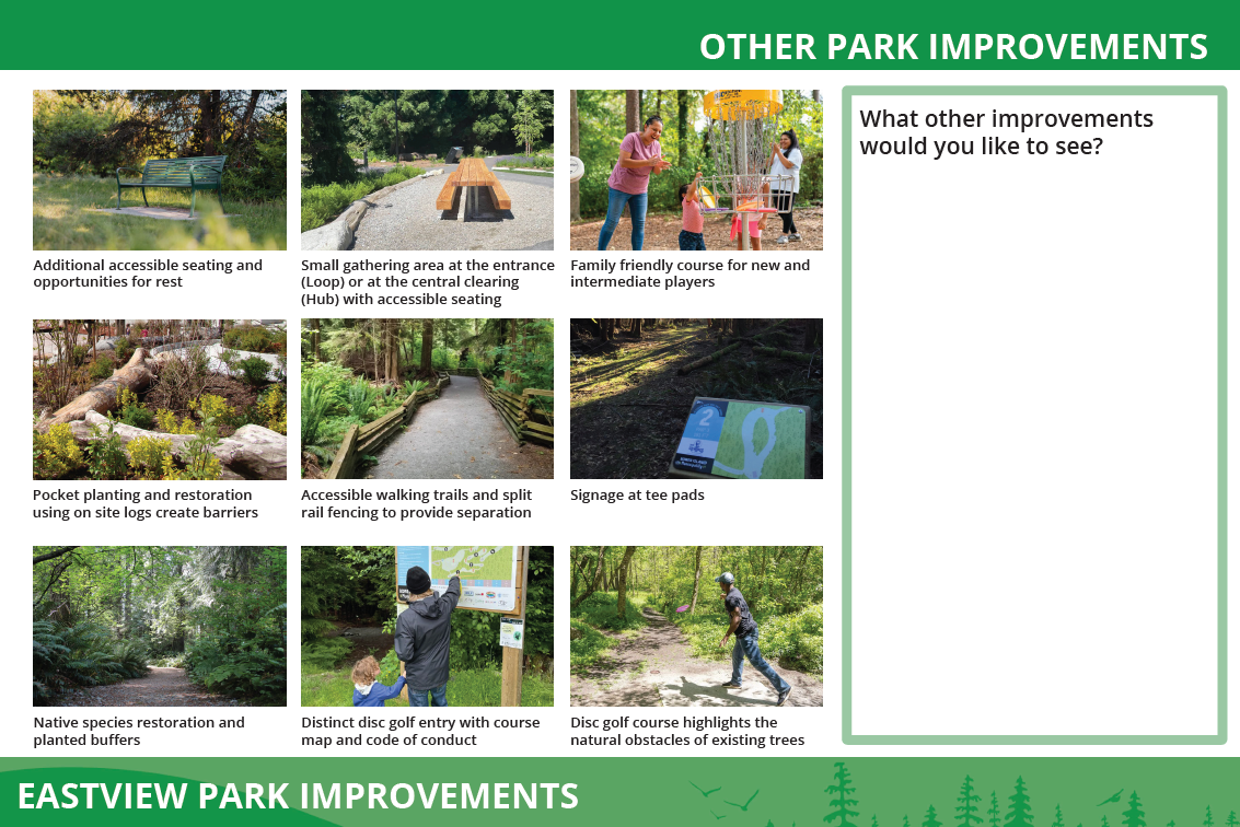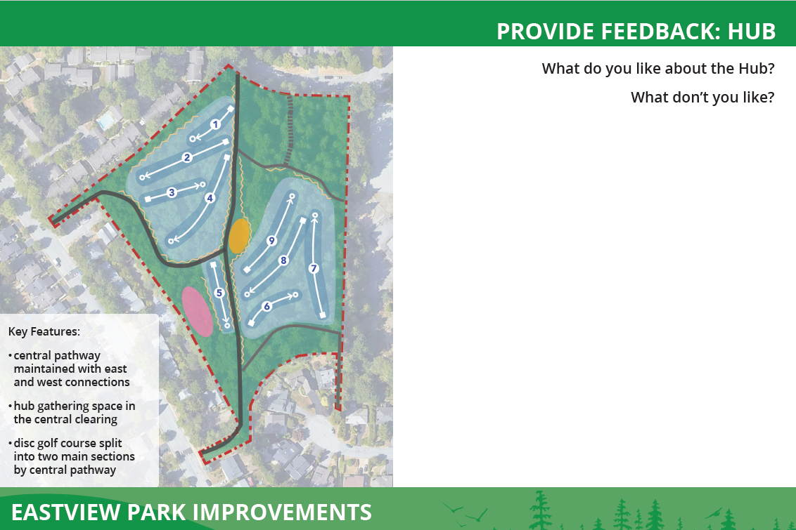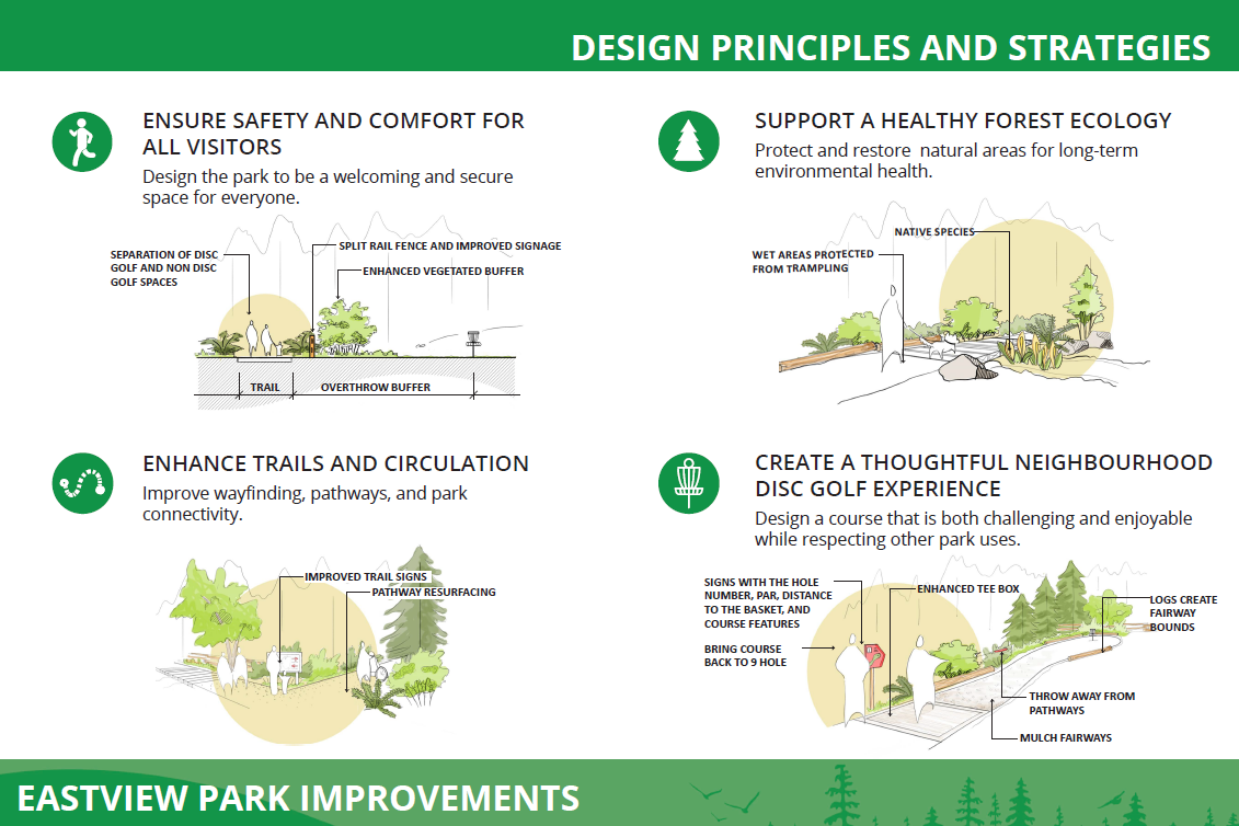 After being directed by Council to make disc golf the primary recreational focus of the park, staff went out to the public again in June and July of 2025. Phase 2 engagement activities shared proposed concepts for Eastview Park and gathered the community's feedback. Click on the images below to review the boards presented in Phase 2.