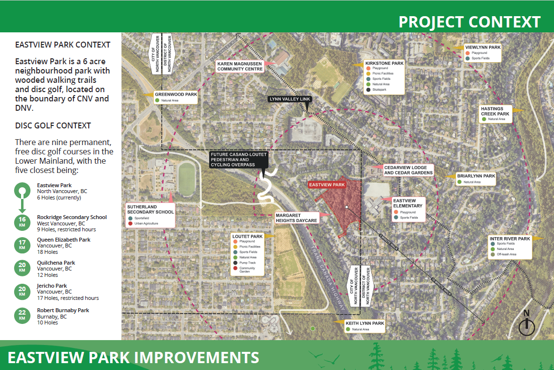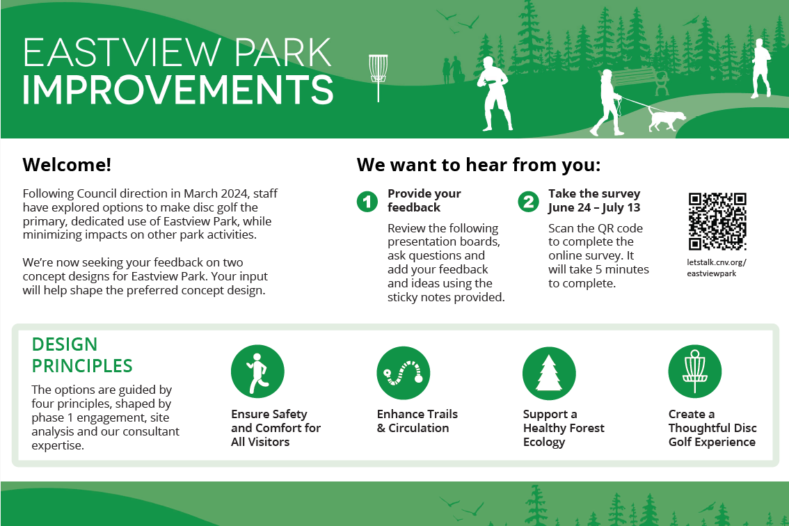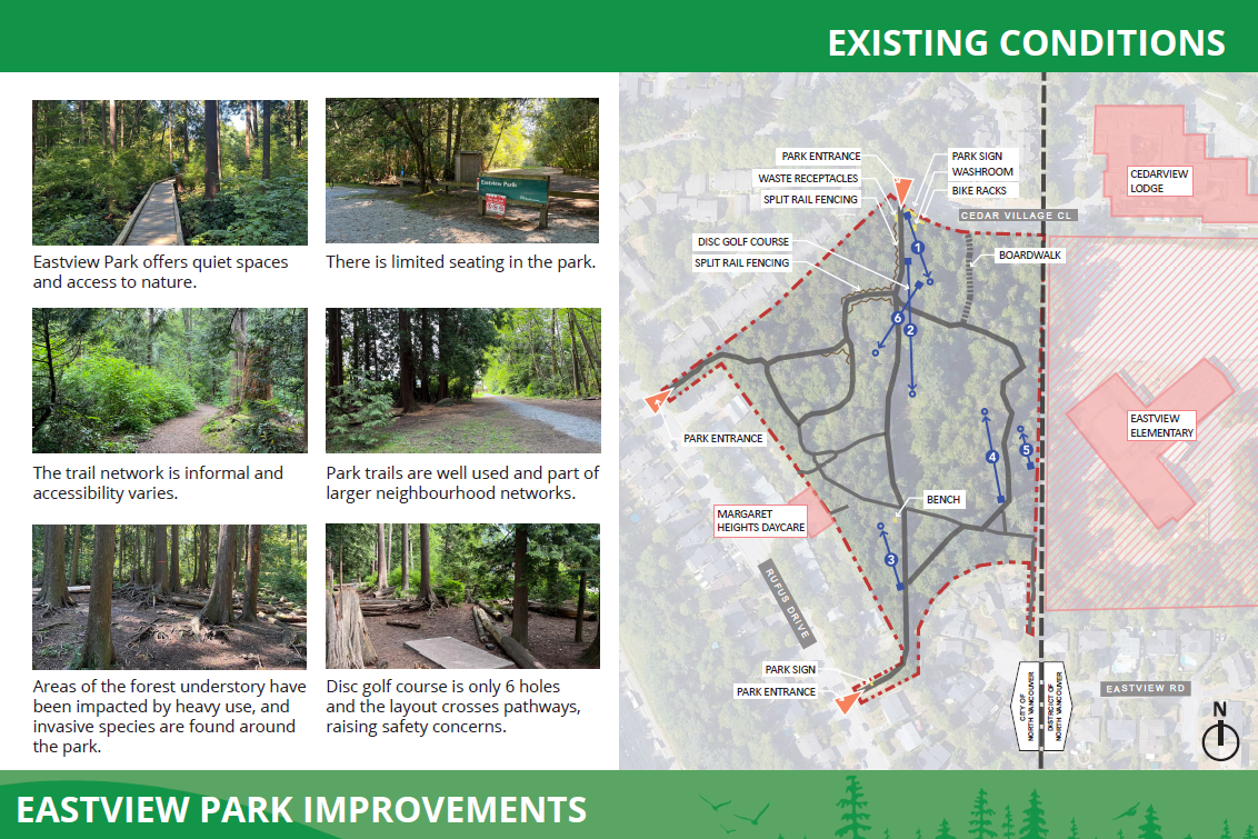 Eastview Park is located on the eastern boundary of the City between Rufus Drive and Mountain Highway. This 2.8 hectare neighbourhood park is accessed for its wooded walking trails, open spaces and disc golf course, and has experienced conflicts between different park users in the past. As a result, in early 2023, City Council directed staff to advance improvements to the space.