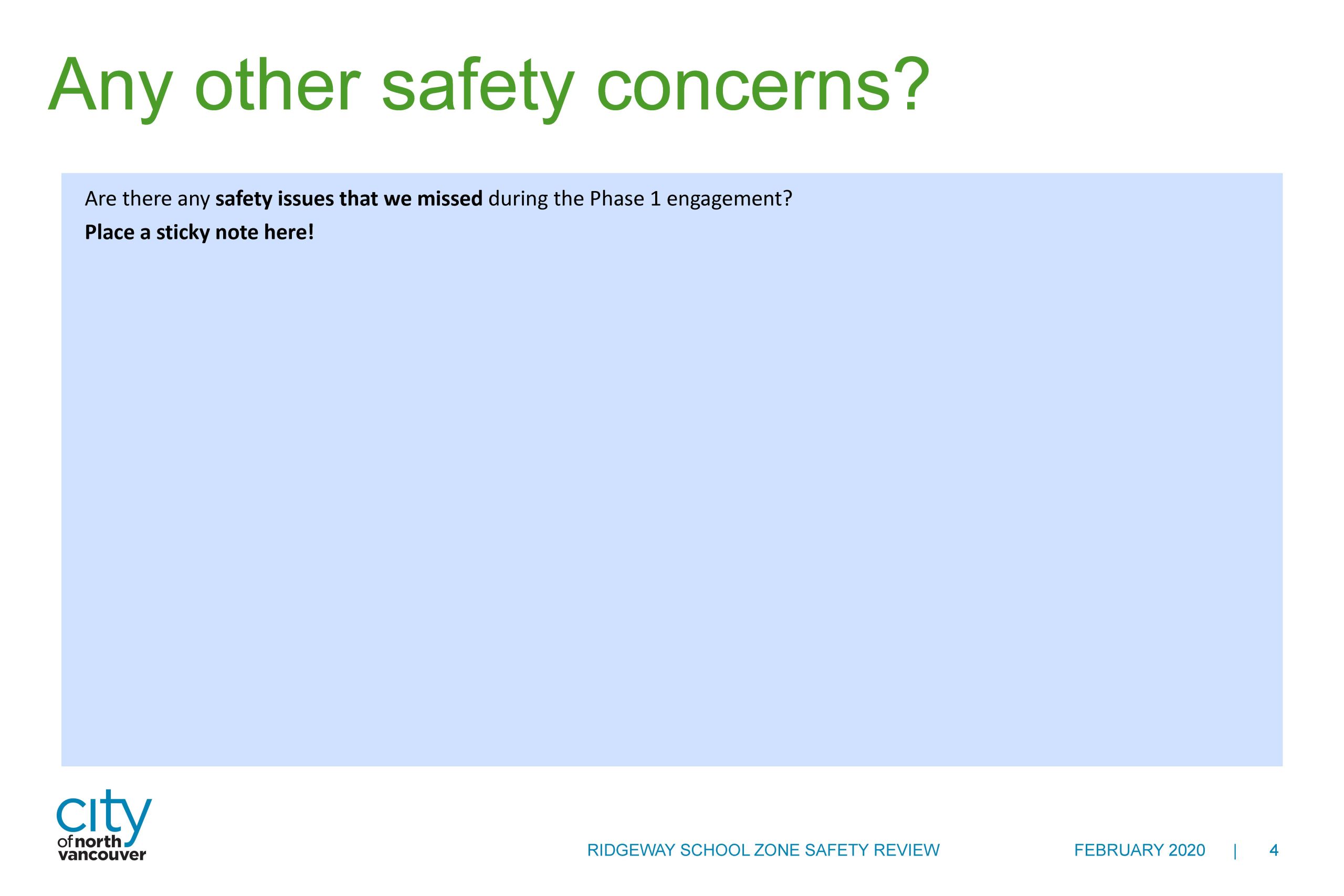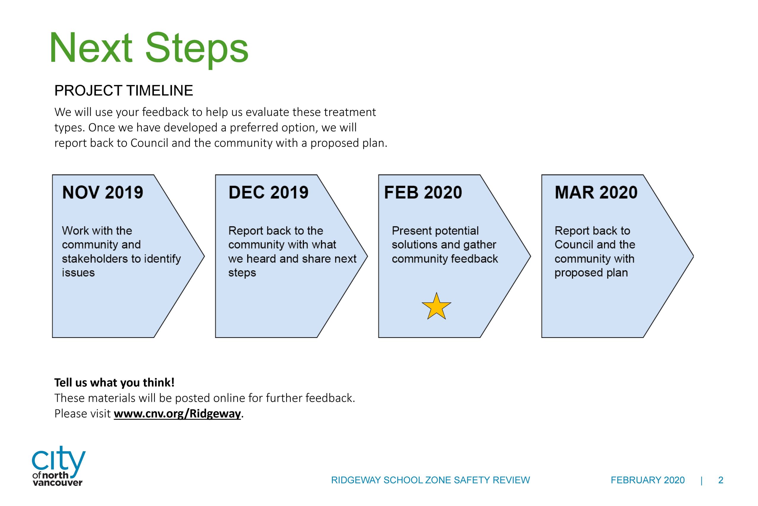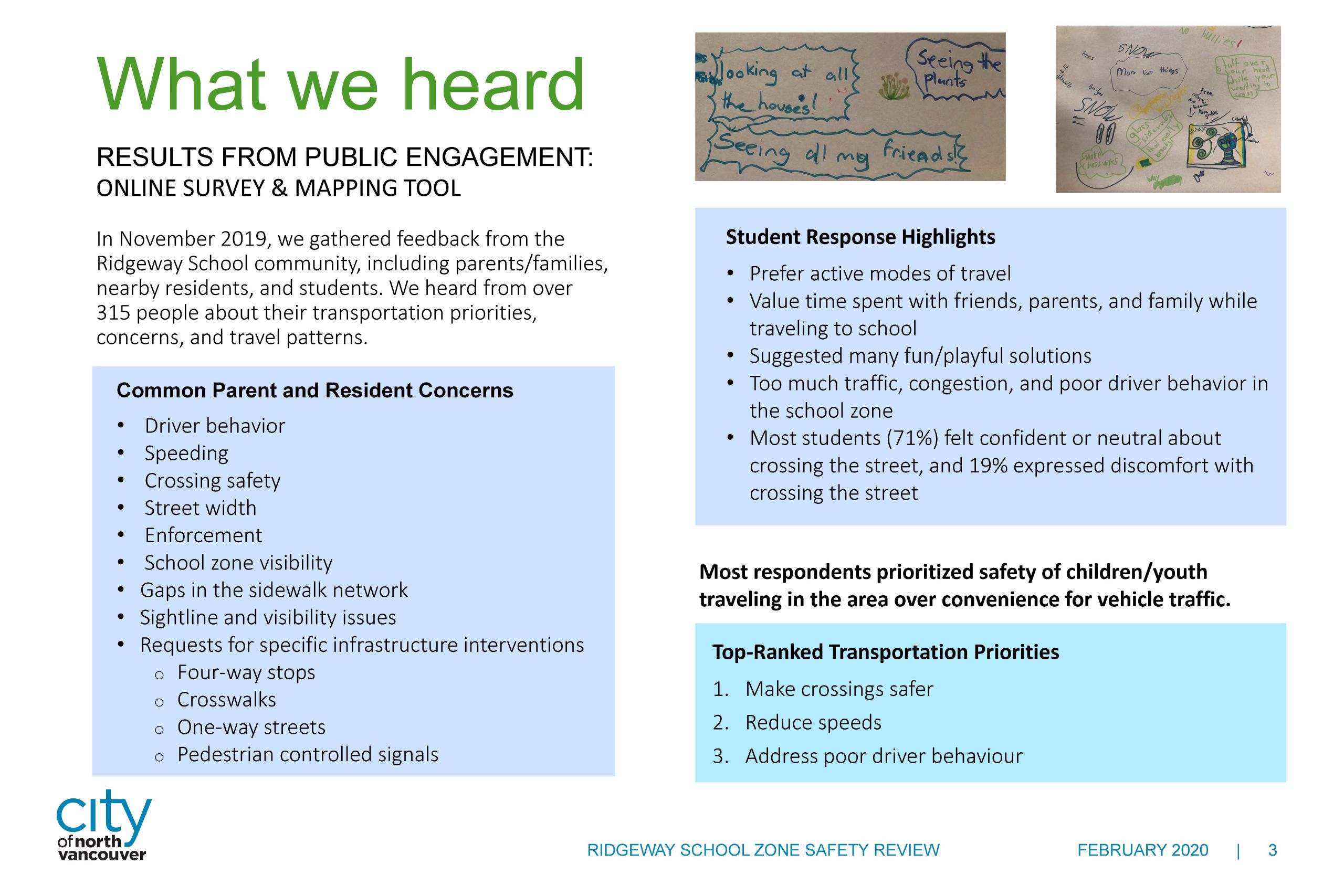 Overall, crossing safety and reducing speed continue to be the most commonly mentioned priorities. To address the safety issues around Ridgeway Elementary we’ve developed a phased action plan.