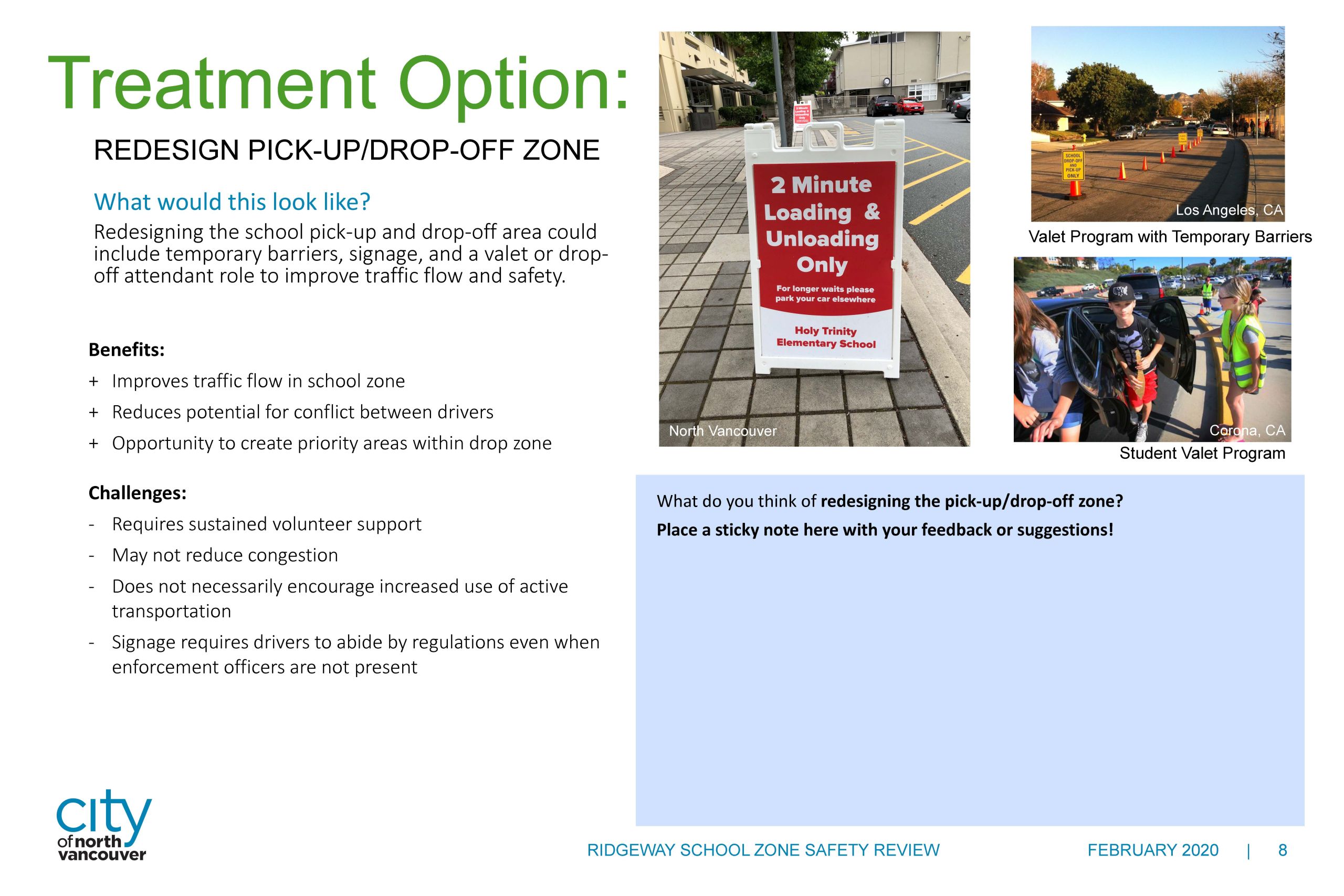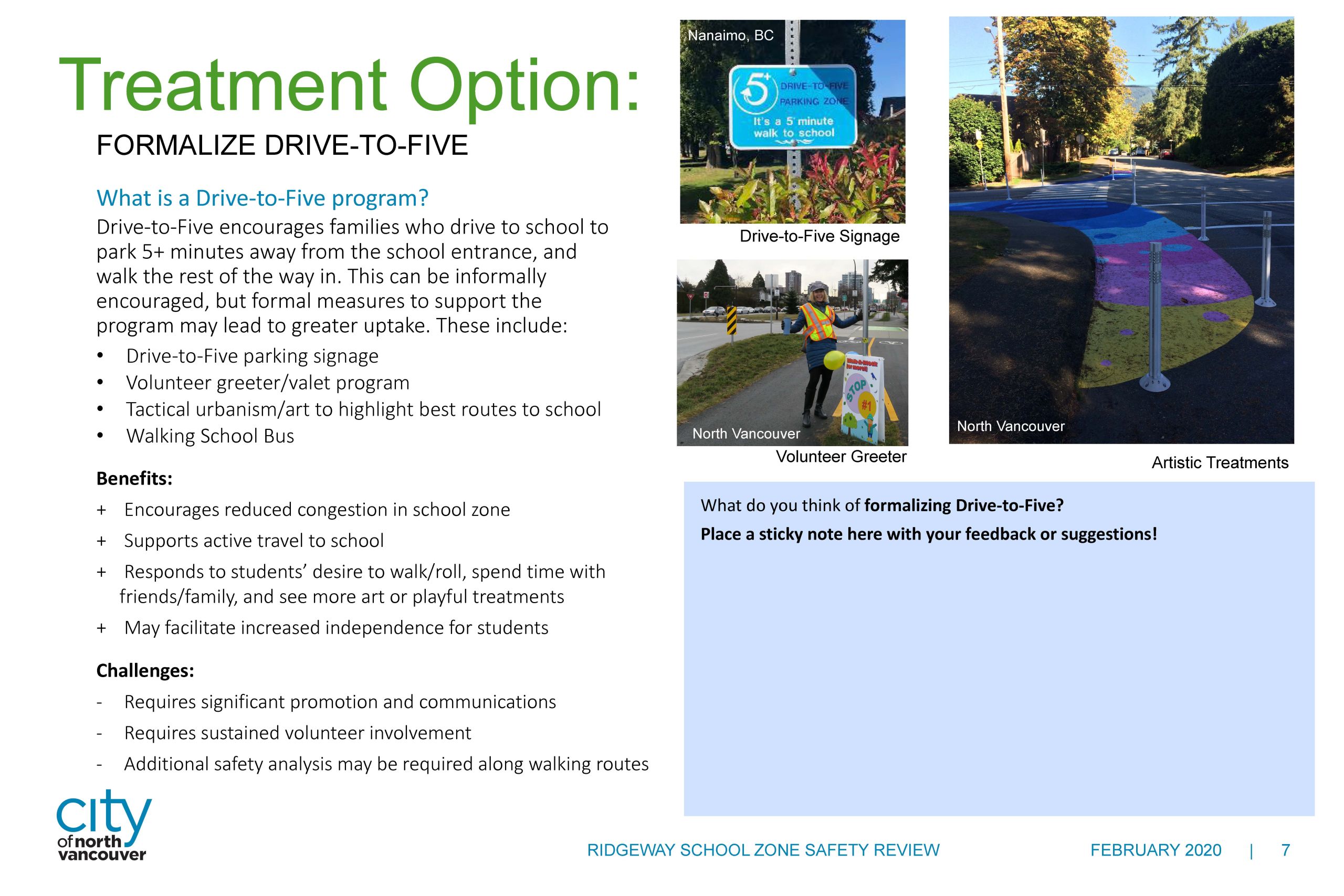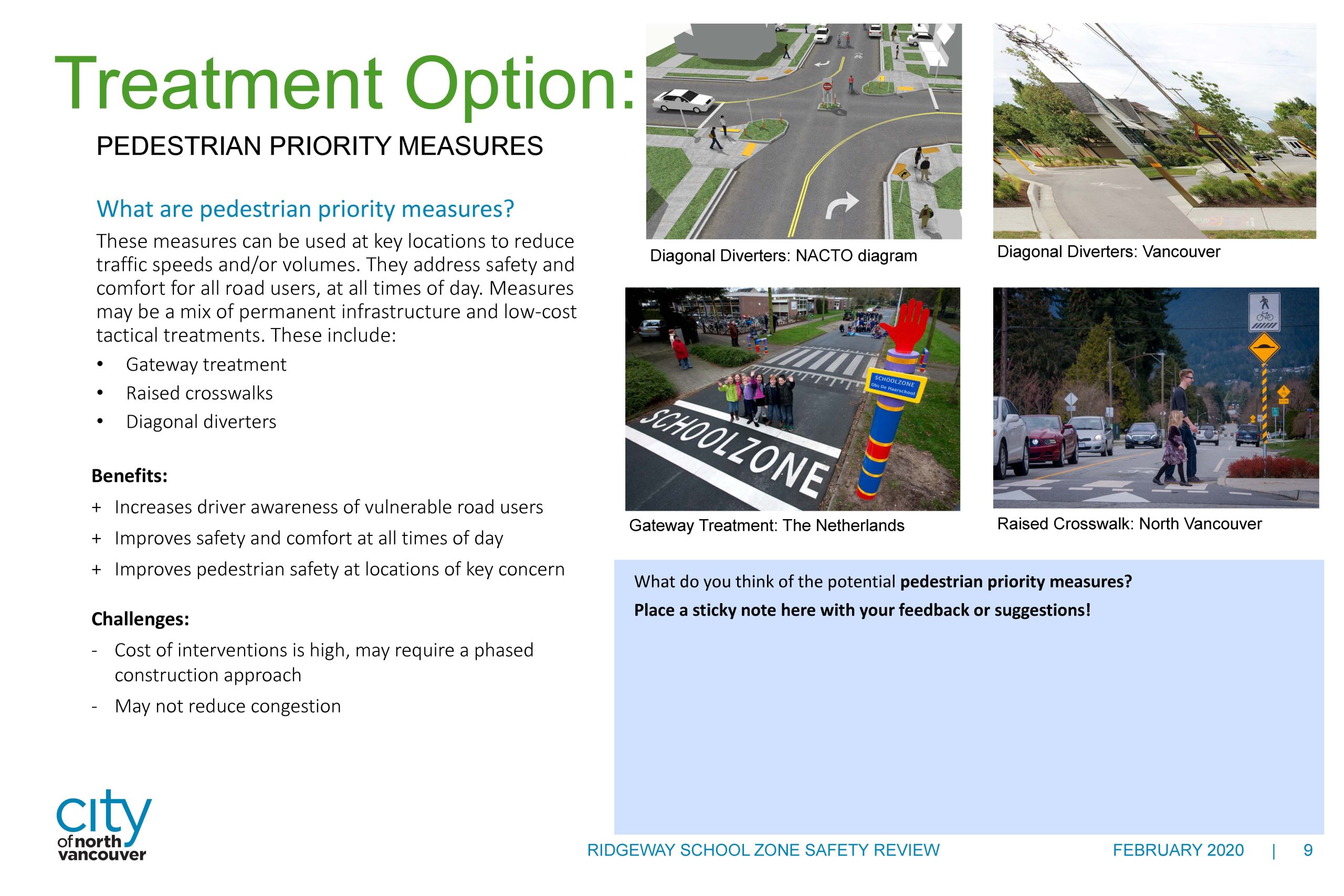 At our open house held February 26, 2020, approximately 70 people attended and another 20 people participated online. We received over 250 written comments, and had many interesting and informative conversations. We heard a wide variety of perspectives on all the treatment options presented. Many people we heard from were in support of infrastructure-based solutions such as improved crossings, measures to encourage speed reduction, and pedestrian priority treatments. We also heard some concerns about: