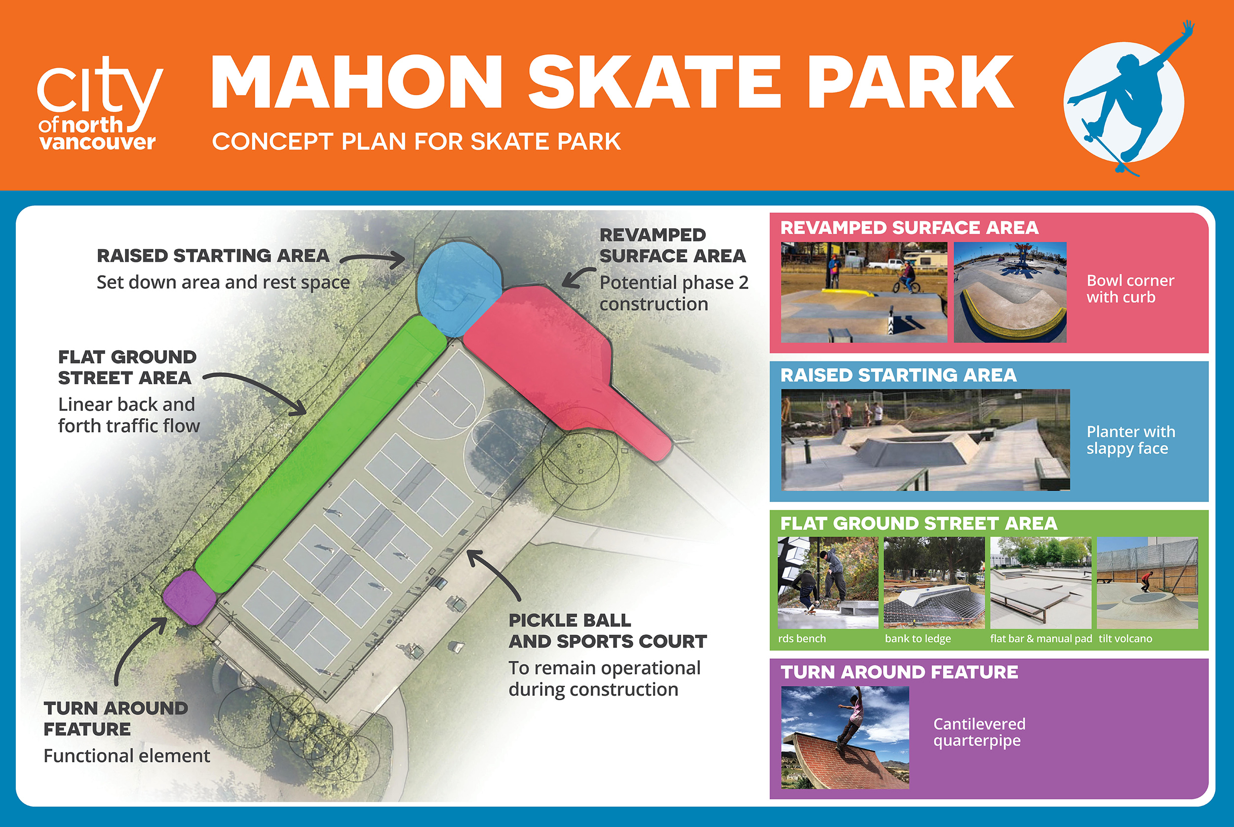 In 2022, the City began building a skate park at Mahon Park, as the Lonsdale Skate Park had been removed for construction of the new Harry Jerome Community Recreation Centre (HJCRC). The Mahon Skate Park will located next to the basketball and pickleball courts.