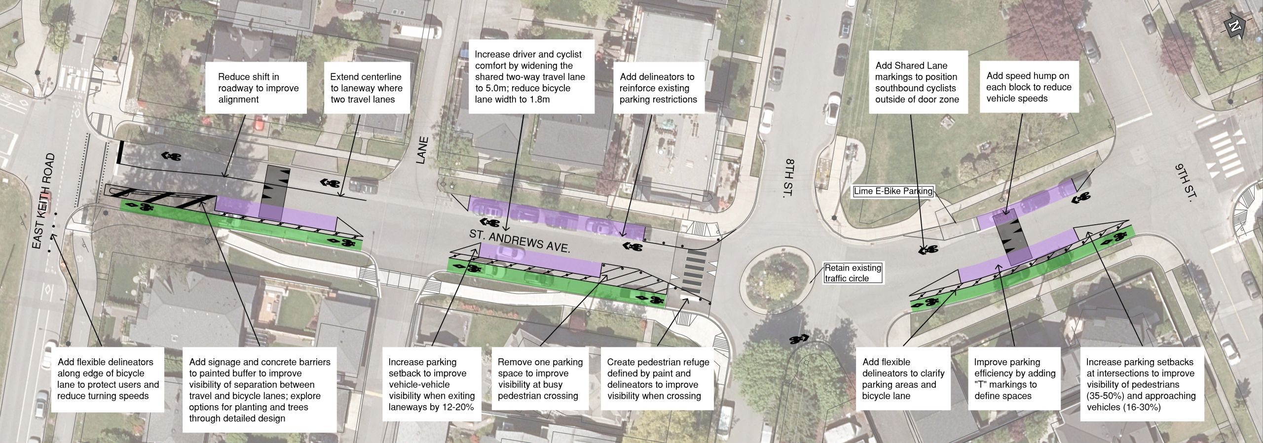 At the January 22, 2024 Council meeting, staff brought forward a report that included a recommended design option from Keith Road to 9th Street. The report outlined a comprehensive process that compared and evaluated 16 design concepts applying a range of design approaches. This evaluation process used a series of weighted criteria informed by Council feedback and the Mobility Strategy to compare trade-offs between designs. Learn more in the ‘Recommended Design – Keith Road to 9th Street’ Council report.