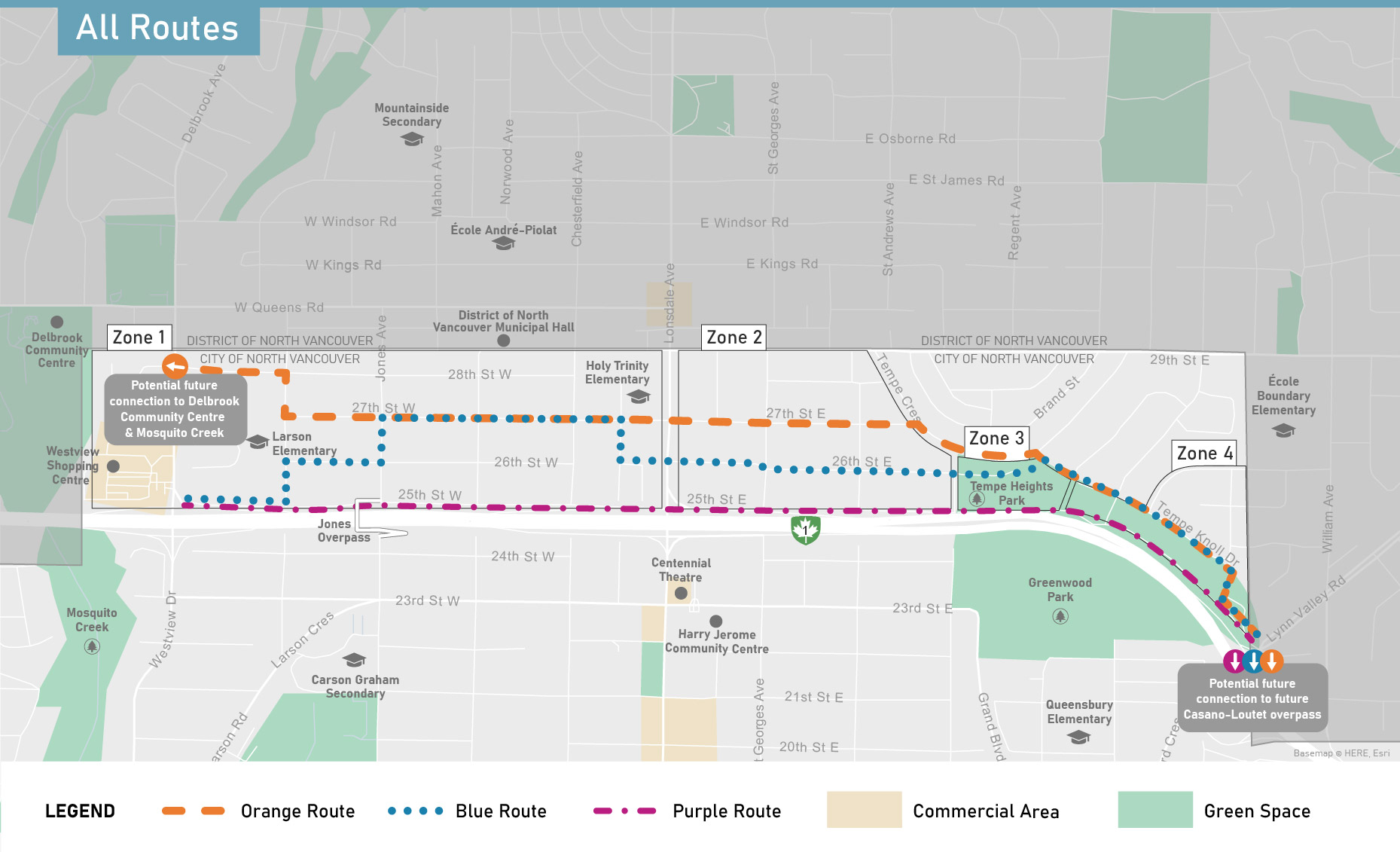 Based on community feedback received during the first phase of engagement, we’ve developed three route options for the Upper Levels Greenway, shown below. Each option travels through four different zones that have unique characteristics to consider. This means the design of the greenway may look different depending on which zone it's travelling through. Learn more about the neighbourhood zones.
