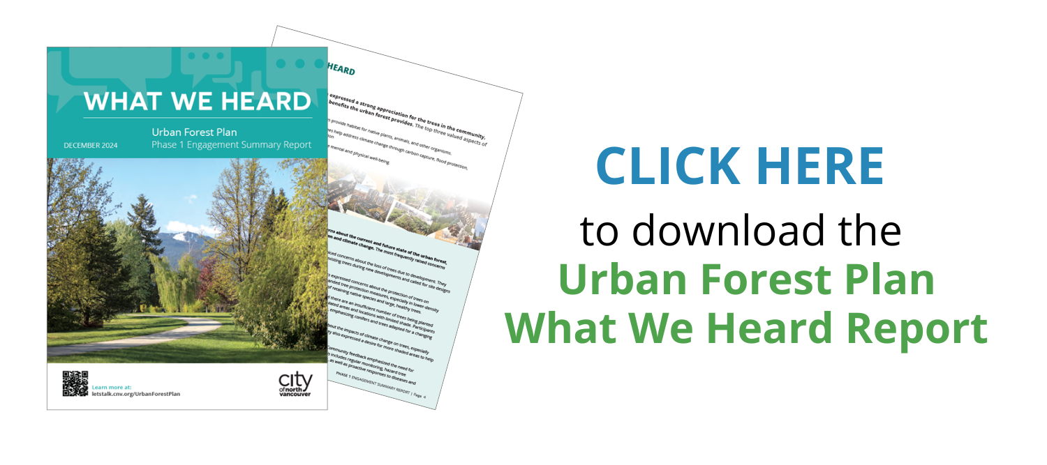 The City of North Vancouver is looking to develop an Urban Forest Plan to better protect, manage and grow the urban forest to deliver long-term benefits to our community. The urban forest is an interconnected ecosystem that includes all the trees and supporting vegetation in the community, and it is located on public and private property such as parks, front and back yards, streets, and in commercial and industrial areas.